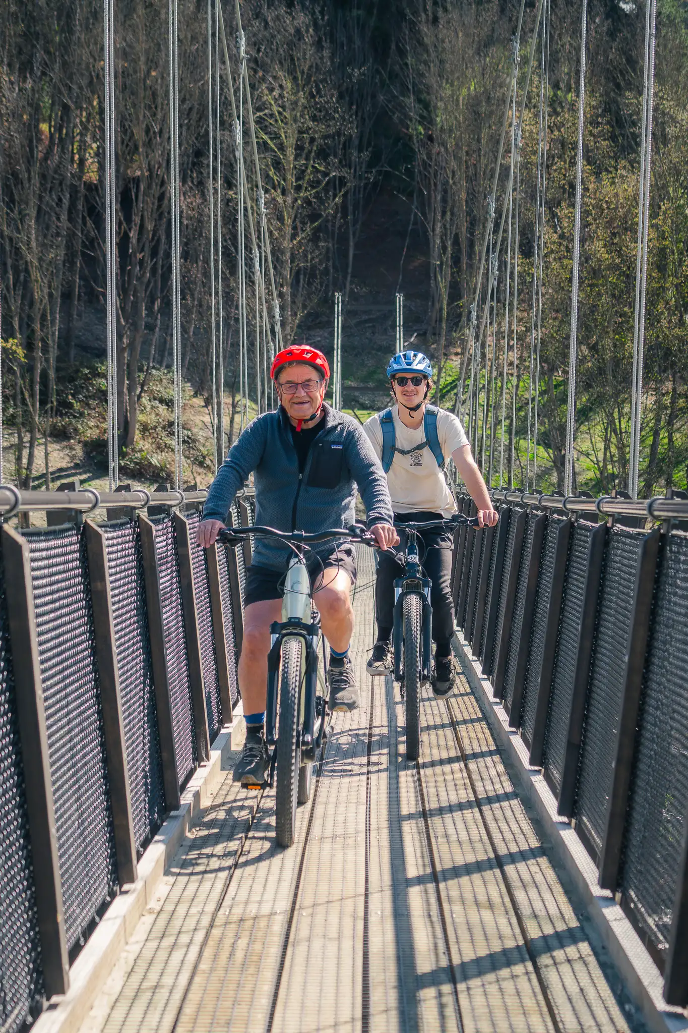 This is a moderate to advanced (Grade 3–4) trail. It includes narrow sections, steep switchbacks, gravel surfaces, a tunnel, and a high suspension bridge. Some parts may require walking your bike.