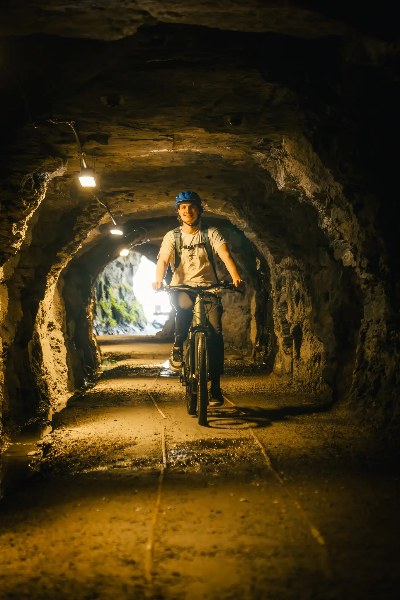 As you near the old Hugo Tunnel (~108 m), the trail tightens with steeper climbs and switchbacks known as a grade‑4 segment. Expect a technical stretch where dismounting is common—timed tunnel lights (activated by buttons) guide your passage through the historic mining structure.